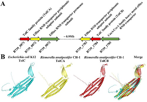 结果表明,其中一个TolC蛋白(编码基因为B739_0871)不仅参与了6种不同金属离子的外排,而且参与了对链霉素、氨苄青霉素和多粘菌素B抗性基因的进化。缺失该tolC基因后,鸭疫里默氏杆菌对雏鸭的毒力和定殖均降低。因此,该TolC蛋白可作为药物开发的潜在靶点,为将来有效防控鸭疫里默氏杆菌感染和耐药基因的进化奠定了基础。