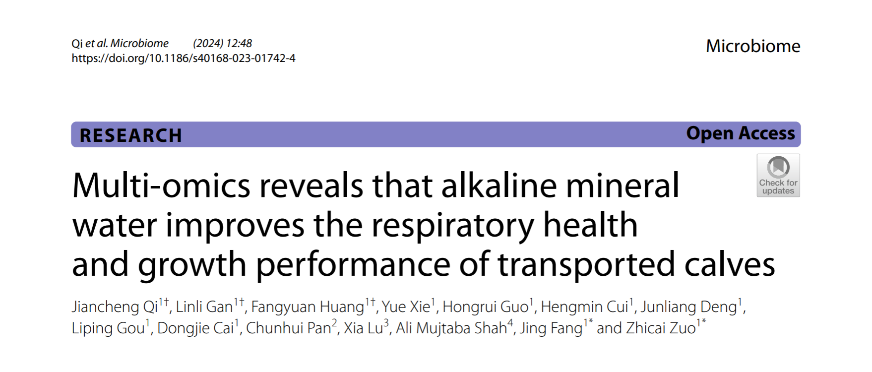 近日,必赢中国官方网站左之才教授研究团队在国际顶级期刊《Microbiome》(中科院JCR 1区,影响因子15.5)上发表了题为“Multi-omics reveals that alkaline mineral water improves the respiratory health and growth performance of transported calves”的研究论文,这项研究为有效缓解犊牛运输应激提供了一种实用的方法,并深入探索了其潜在的机制,为畜牧业的可持续发展提供了有力支持。
