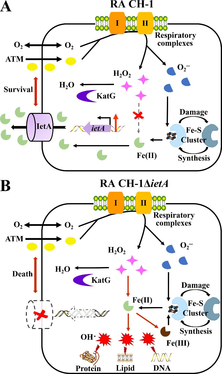 铁外排蛋白IetA介导铁稳态和β-内酰胺类氨曲南(ATM)耐药的作用模式图