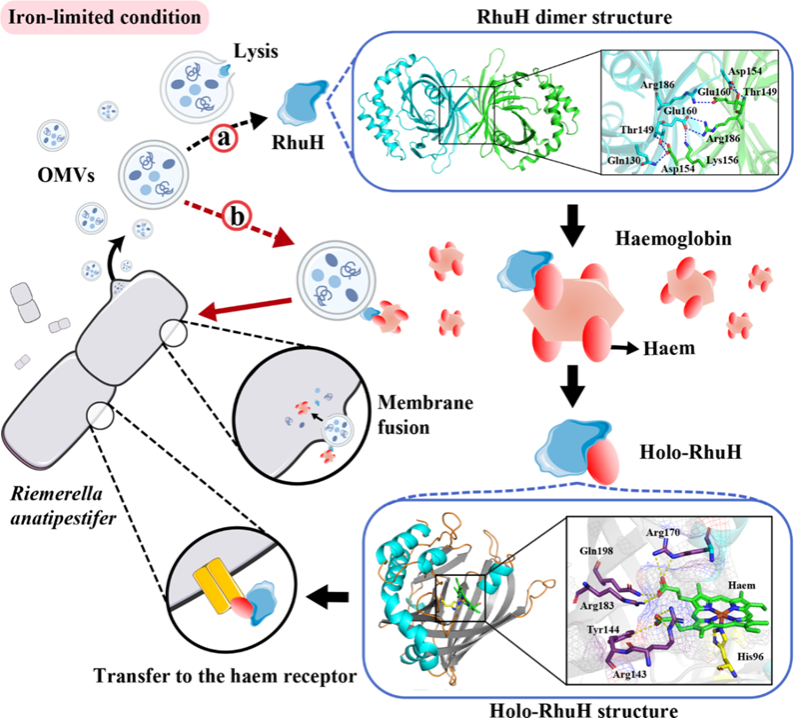 近日,由国家农业(水禽)产业技术体系岗位科学家、必赢中国官方网站程安春/刘马峰教授团队和福建师范大学欧阳松应教授团队合作在中科院一区Top期刊Advanced Science上发表题为“Structural Basis and Mechanism of a Unique Haemophore in the Haem-iron Acquisition by Riemerella anatipestifer(一种新型血红素载体蛋白参与鸭疫里默氏杆菌血红素摄取的结构基础及作用机制)”的研究论文。该研究以鸭疫里默氏杆菌为代表,在黄杆菌目中鉴定了一种新型的血红素载体蛋白RhuH,并解析了其独特的结构特征和作用机制,为深入理解黄杆菌目细菌对血红素的摄取机制提供了新的见解。