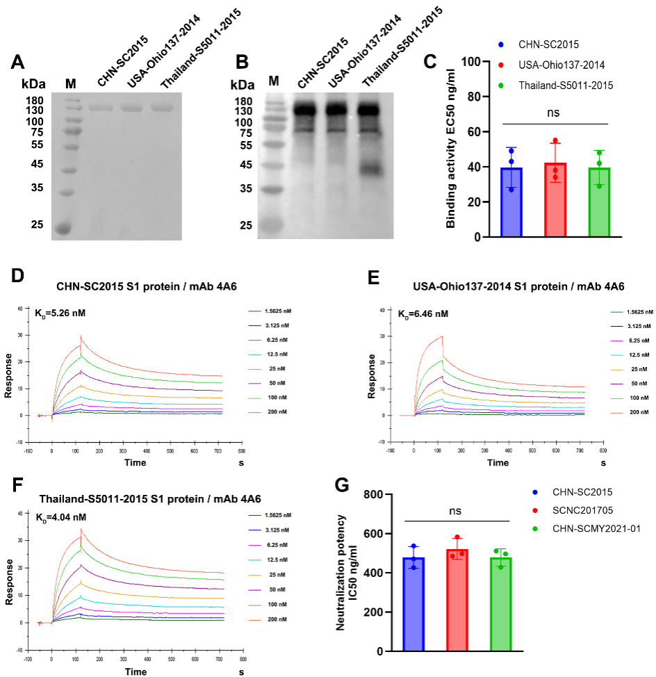 本研究通过间接ELISA和SPR(表面等离子共振)评价了mAb4A6的广谱抗病毒活性。结果表明mAb4A6与全球不同区域的代表流行毒株(例如美国USA-Ohio137-2014,中国CHN-SC2015和东南亚的Thailand-S5011-2015等)均具有相似的亲和力。另外,通过噬斑减少中和实验证实了mAb4A6与本中心分离的不同年代的PDCoV代表毒株(CHN-SC2015, SCNC201705和CHN-SCMY2021-01)具有相似的中和能力。以上结果表明,mAb4A6对不同PDCoV毒株具有广谱性中和活性和相似的亲和力。