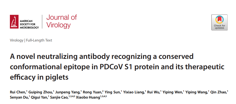2025年1月22日,猪病研究中心黄小波教授团队在病毒学权威期刊Journal of Virology在线发表了题为“A novel neutralizing antibody recognizing a conserved conformational epitope in PDCoV S1 protein and its therapeutic efficacy in piglets(一种识别PDCoV S1蛋白保守构象表位的新型中和抗体及其在仔猪中的治疗效果)”的研究论文。该研究鉴定了新型中和抗体mAb 4A6所识别的构象表位,并在仔猪体内评估了mAb 4A6对PDCoV感染仔猪的治疗作用。