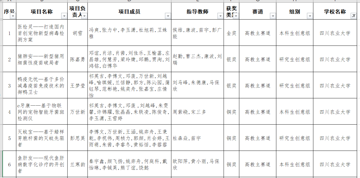 自大赛启动以来,学院高度重视,积极动员师生参与,深入挖掘优质项目,全力推进赛前筹备工作。备赛期间,学院根据大赛不同赛段项目实际需求,有力做好大赛的组织、宣传和协调工作。同时,采取线上与线下相结合的方式,分赛道、分组别、分层次邀请业界专家进行指导和评审,推动项目开展系统训练。最终,《医检灵——打造国内首创宠物新型病毒检测方案》荣获金奖,《猪肺安——新型猪用细菌性疫苗破局者》和《鸭疫无忧—基于多价减毒疫苗免疫技术的御鸭卫士》获得银奖,《e 牙康——基于物联网的宠物智能牙菌斑检测仪》《灭蚊宝——基于蜡样芽胞杆菌的灭蚊先驱者》和《鱼肝友——现代鱼肝病数字化诊疗的开创者》获得铜奖。