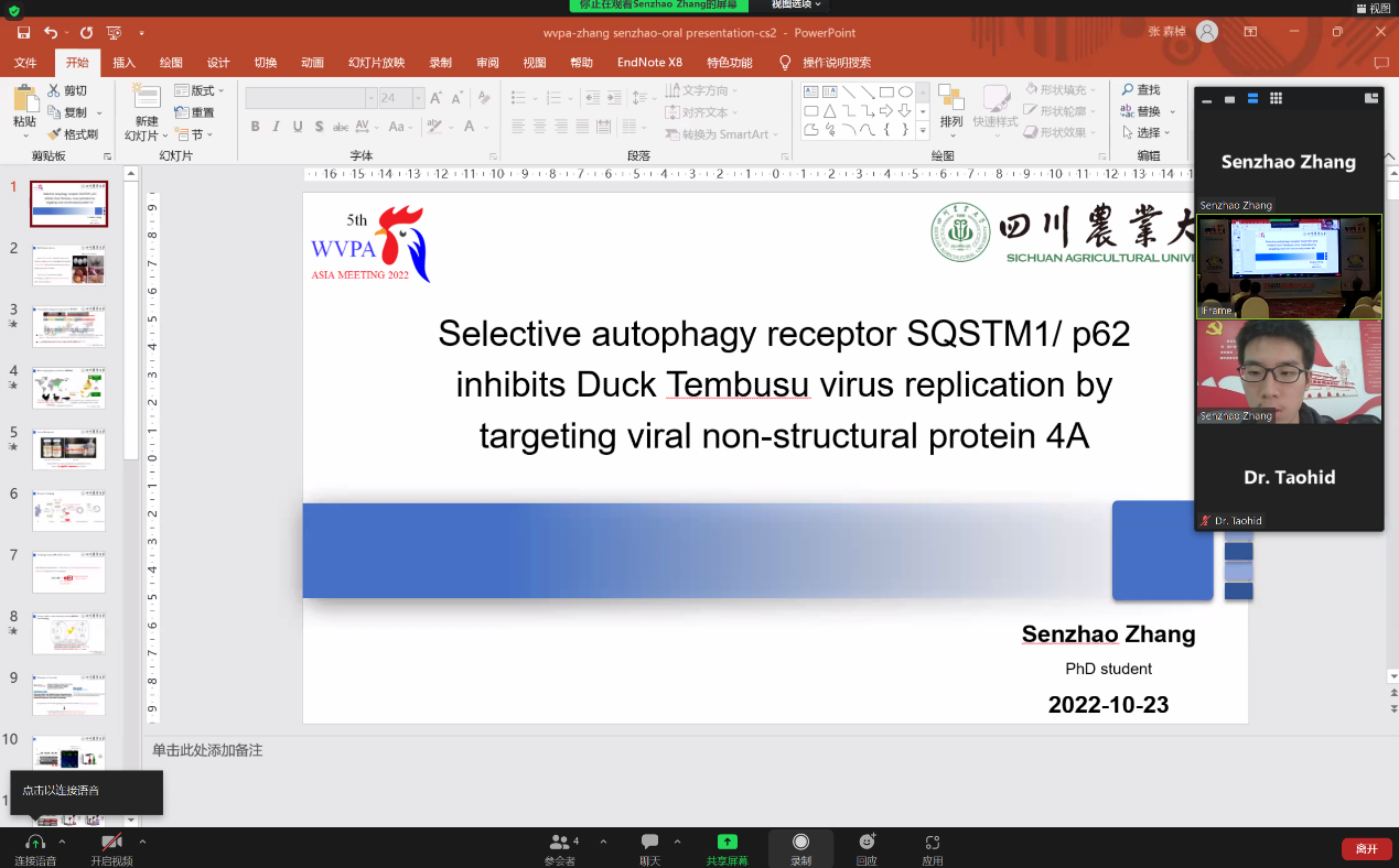 因疫情影响,张森棹博士通过网络连线的方式参与会议,并作题为“Selective autophagy receptor SQSTM1/ p62 inhibits Duck Tembusu virus replication by targeting viral non-structural protein 4A”(选择性自噬受体SQSTM1/p62通过靶向病毒非结构蛋白4A抑制鸭坦布苏病毒复制)的学术报告,向同行展示了近年来陈舜教授课题组在鸭坦布苏病毒与宿主互作方面的最新发现:自噬受体p62以泛素依赖的方式介导TMUV NS4A的选择性自噬降解。