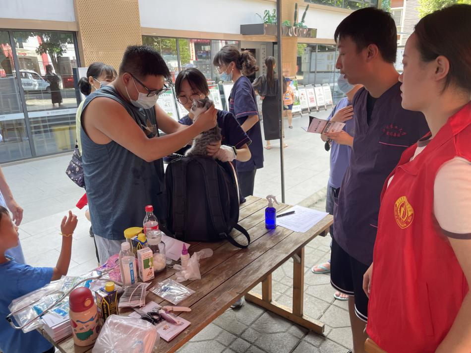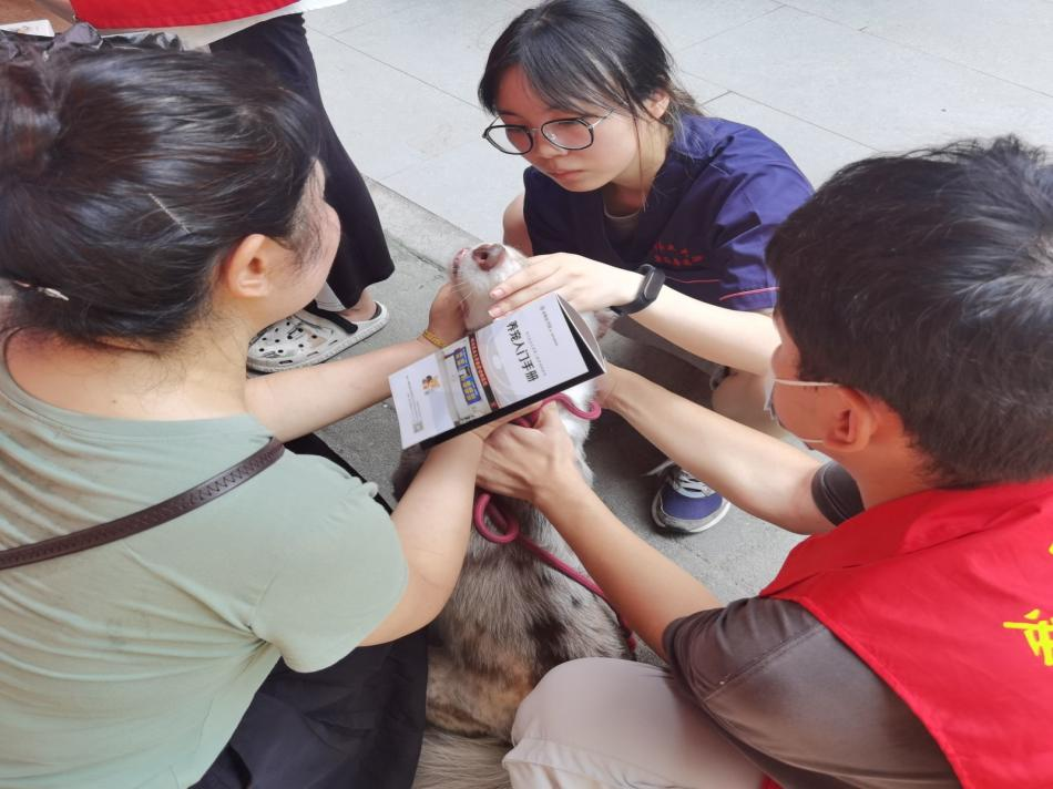 13、14日,团队成员们则顶着高温,深入社区,向当地居民科普养宠常识、宠物常见病防治要点及人兽共患病防控等知识,并向居民们发放了由教学动物医院自制的《科学养宠知识手册》。