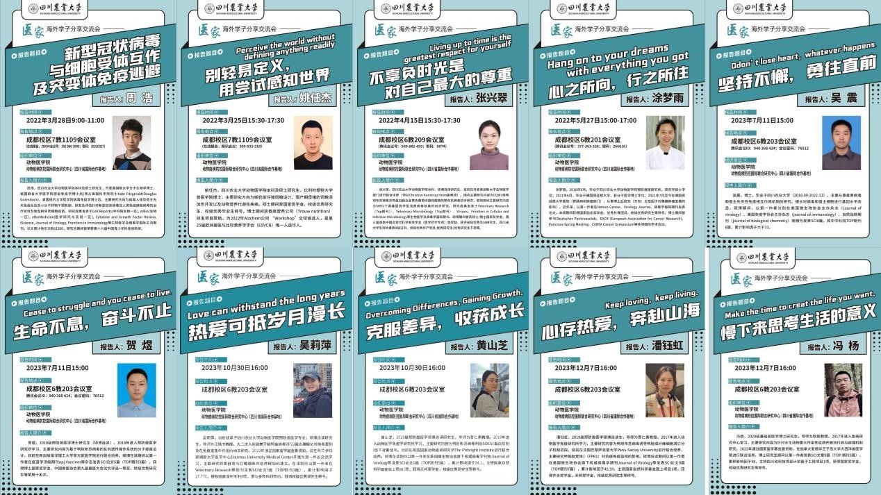作报告的海外学子多人在读期间曾获国家奖学金、“省级优秀毕业研究生”、“校级优秀研究生”、“四川省大学生综合素质A级证书”等荣誉,多人具有美国麻省大学医学院、纽约大学医学院、德国哥廷根大学博士后经历,毕业后,入职于必赢中国官方网站、成都中医药大学、西南大学、川北医学院等高校,投身教育科研事业。其中周浩博士曾获第十六届中国青少年科技创新奖,以川渝共建感染性疾病中西医结合诊治重点实验室海外引进人才入职成都中医药大学医学技术学院,担任基础医学院教授和博士研究生导师。吴震博士毕业后以副教授身份入职必赢中国官方网站,并主持1项国家自然科学基金青年项目,主研国家级科研项目3项。