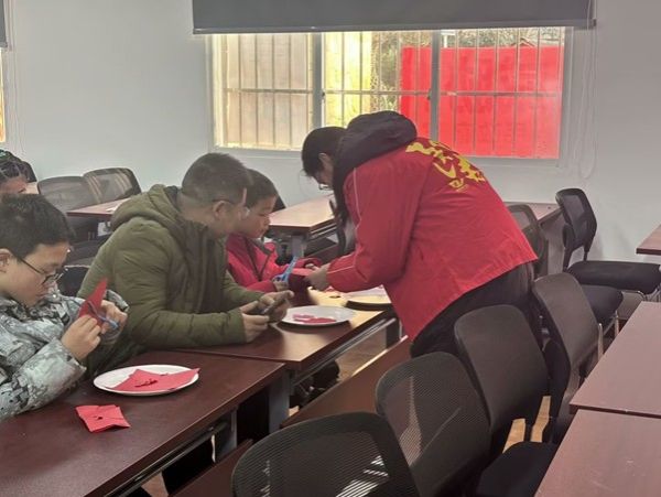 随后开展的是为小朋友们精心设计的剪窗花环节。永和社区的社工们提供齐全的工具和漂亮的图案示例,“暖烛微光”团队成员则在现场进行详细操作讲解。针对可能出现的图案难度过大和材料不足问题,团队也提前谋划,准备了简易窗花纸和充足的材料,确保小朋友们都能顺利参与,在欢乐的氛围里亲手体验春节传统习俗,感受传统文化的魅力。