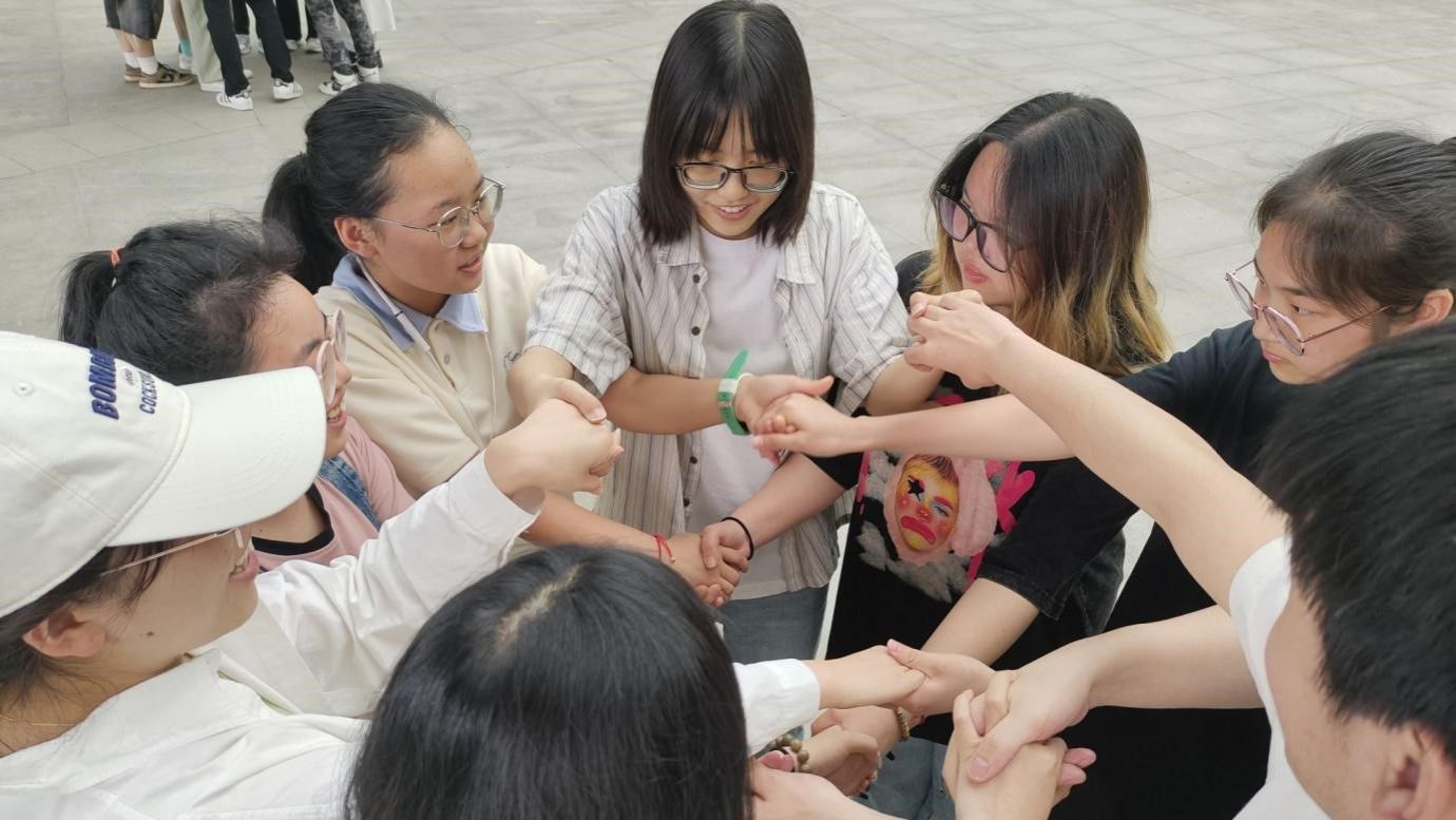 (图为药学202202班同学正在进行破冰游戏“心有千千结”)