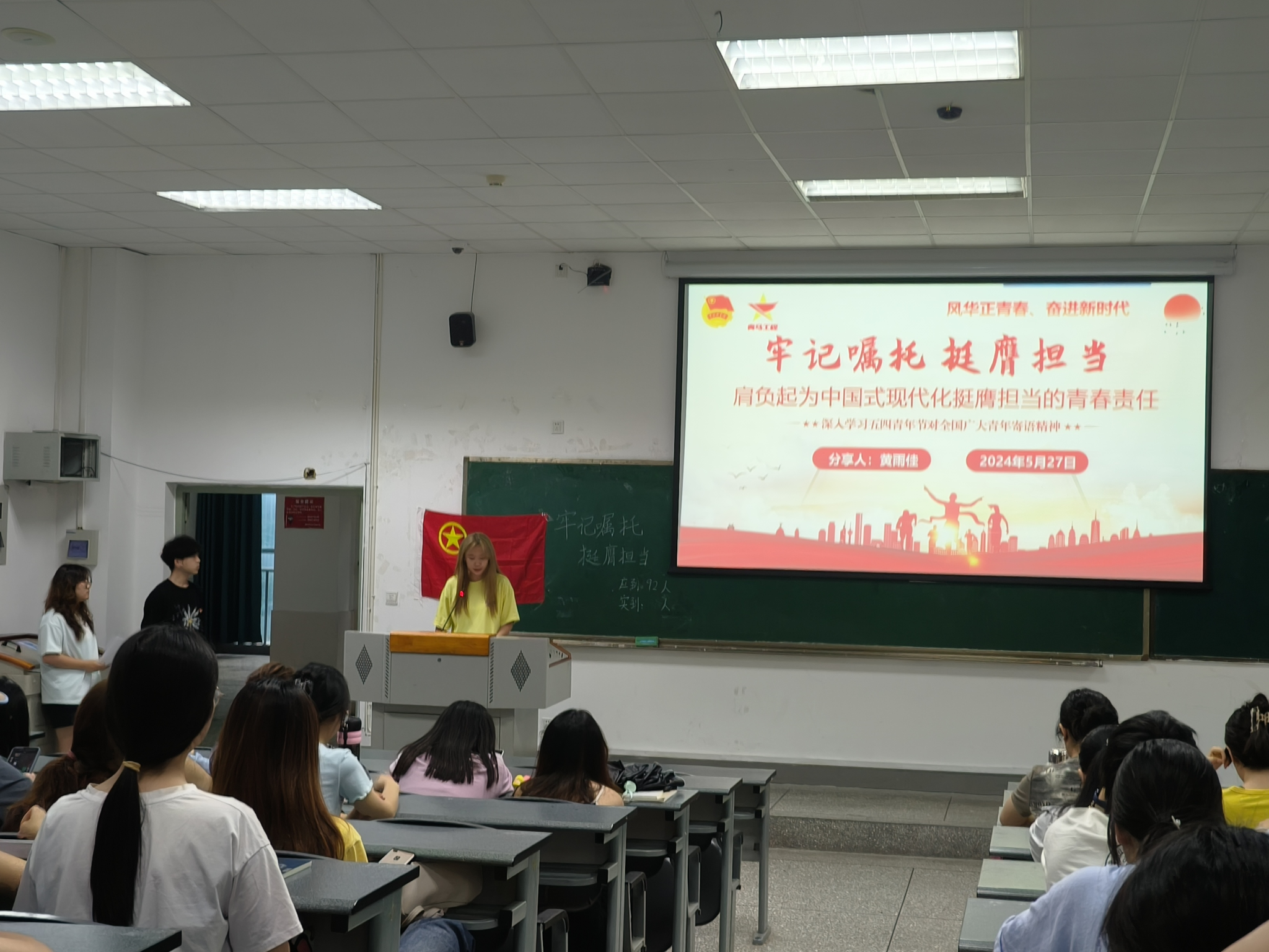 伴随着齐声唱响的团歌,本次班团活动正式拉开了帷幕。主持人颜诗馨带领参会成员共同观看校团委原创五四主题MV《青春的誓言》,带领参会成员感悟“青春有为,担当有我!”的誓言。随后由青马班学员黄雨佳分享了当代青年的责任担当,深入学习了五四青年节习近平总书记对全国广大青年的寄语精神。黄雨佳在分享过程中强调中国式现代化是青年最好的机遇,青年是推进中国式现代化的重要力量,当代青年应厚植爱国情怀,挺膺奋进担当。