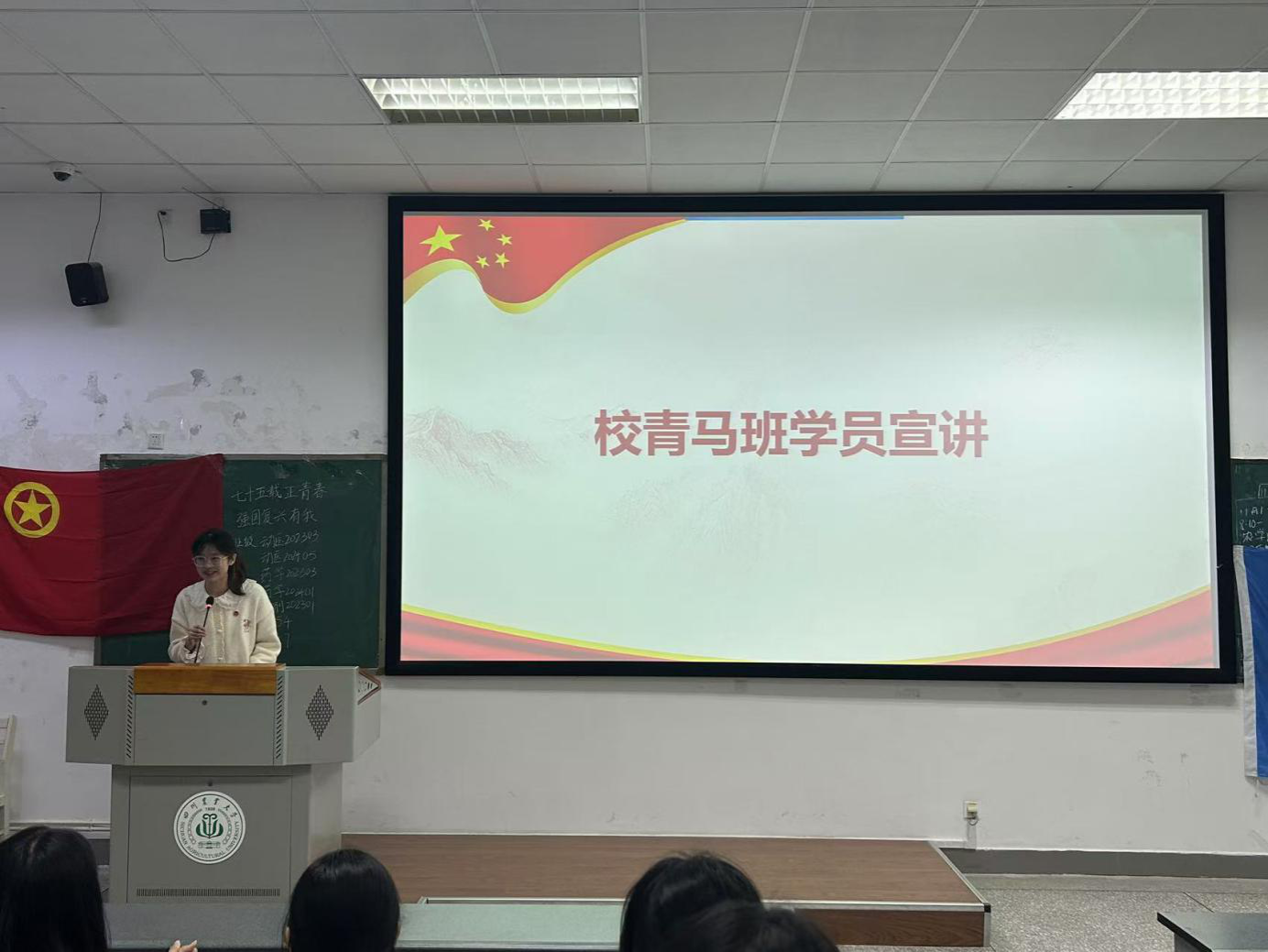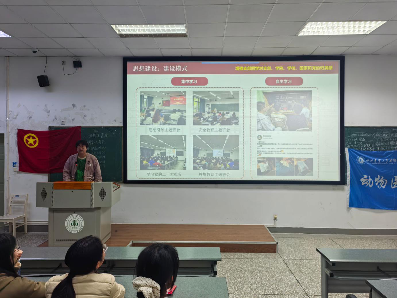 活动伊始,团员们齐声高唱团歌。随后,主持人卓文超邀请了校青马班的杰出学员何姚姗,引导全体成员开展“庆祝中华人民共和国成立75周年”专题学习。何姚姗深入回顾了75年来国家经历的重大历史时刻,并强调了历史给予我们的启示:必须坚定不移地坚持中国共产党的领导,坚持以人民为中心的发展思想,坚持中国特色社会主义制度,坚持深化改革和扩大开放。她还特别指出:“当代青年应高举爱国主义的旗帜,将个人理想融入国家和民族的伟大事业中,为实现中华民族的伟大复兴贡献青春力量。”在专题学习的最后,卓文超向在场同学们展示了川农学子们制作的优美手账,手账传递了川农学子们作为青年对于中国75年来奋斗的自豪、祖国繁荣昌盛的殷切希望以及未来为祖国美好未来拼搏奋进的专属于青年的那一份热忱。