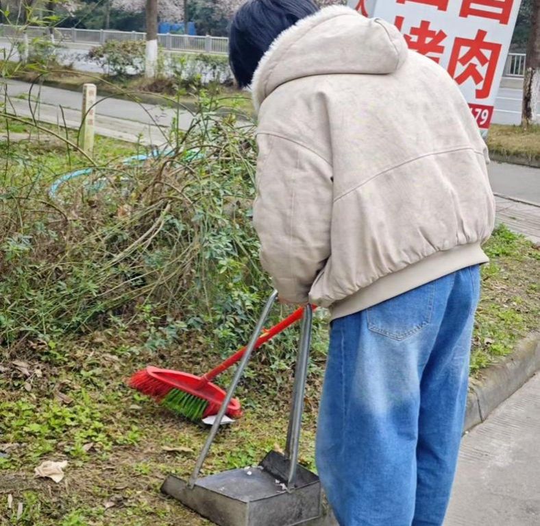 活动伊始,班长邓浩然进行了简短的动员讲话,号召学子们从点滴做起,践行“奉献、友爱、互助、进步”的志愿服务理念,并强调了安全注意事项。随后,全体成员分为多个小组迅速投入清扫工作。有的学子细致清理路面烟头、纸屑,有的深入绿化带捡拾隐藏的塑料瓶、包装袋,还有的负责擦拭公交站牌、垃圾桶等公共设施。尽管春寒未褪,但学子们热情高涨,分工明确,短短两小时便让街道焕然一新。