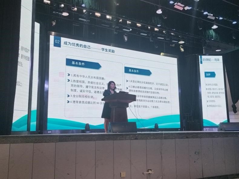 紧接着,张淑英老师为新生们指引了成为优秀自我的路径。她深入浅出地讲解了学生综合素质测评的重要性及评估标准,同时详细介绍了学生奖励体系,以此激励新生们积极参与学校组织的各项活动,不仅丰富课余生活,更能在实践中锻炼自我,提升个人的综合素质与能力。此外,张老师还介绍了学工系统和教务系统的使用方法,以及学籍管理的相关规定,确保新生们能够迅速适应大学生活的新环境,为未来的学习与发展打下坚实的基础。