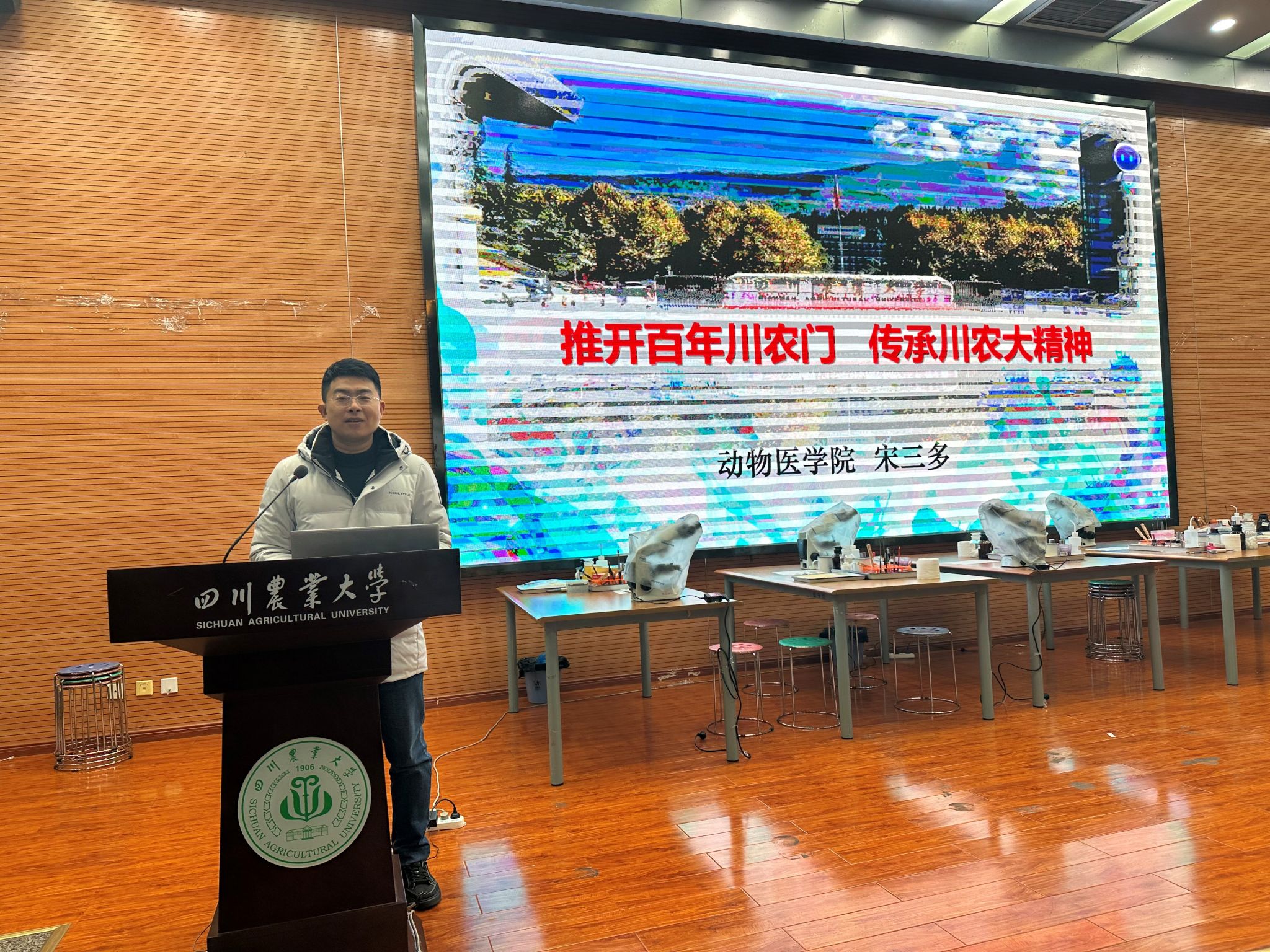 12月13日下午,学院党委副书记宋三多在成都校区二教报告厅为全院师生党员带来了一堂题为“推开百年川农门,传承川农大精神”的主题党课。宋三多从入口之“门”——变迁、出口之“门”——成果、同门之“门”——传承三个维度,深刻阐述了必赢中国官方网站(以下简称川农)的悠久历史、辉煌成就与不朽精神。