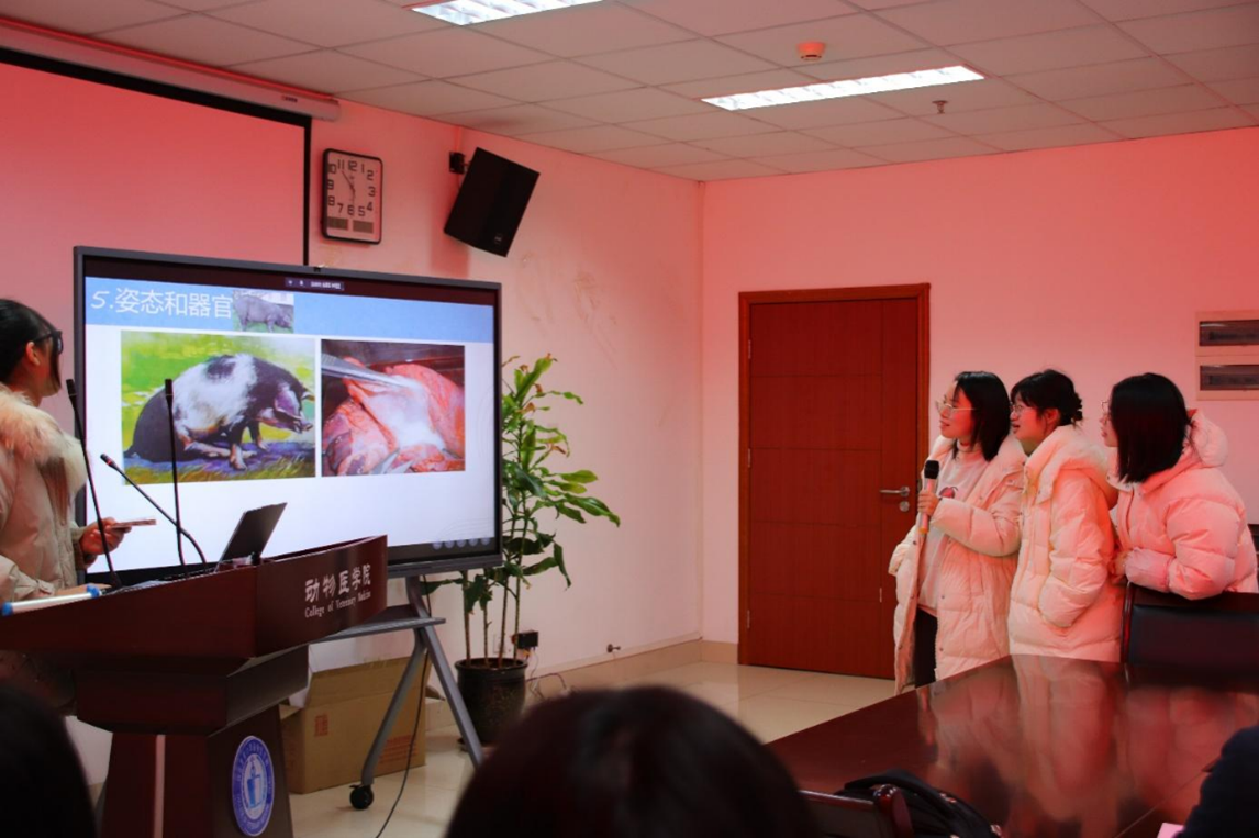 第二阶段为答辩展示环节,分为两部分。第一部分,各团队在有限的时间内,通过简洁凝练的语言以及清晰明了的ppt展示,自信从容地汇报了各团队的剖检结果及病理检验结果。评委们也对各队伍的汇报结果进行了深入的研讨分析,并提出建设性的指导和内容反馈。第二部分,各团队通过知识竞答,快速地辨别出动物的不同疾病。