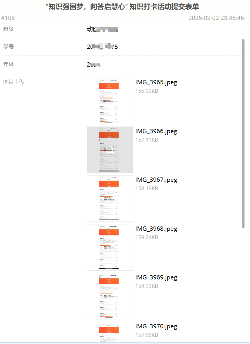 在活动过程中,同学们积极参与“学习强国”平台的“趣味答题”板块,通过连续10天的打卡任务,展现了良好的学习热情和自律精神。每日完成答题后,同学们认真保存打卡截图,并对截图中的班级、姓名、学号进行打码处理,确保了活动的规范性和保密性。活动结束后,大家按时提交了所有打码后的打卡截图,为活动画上了圆满的句号。