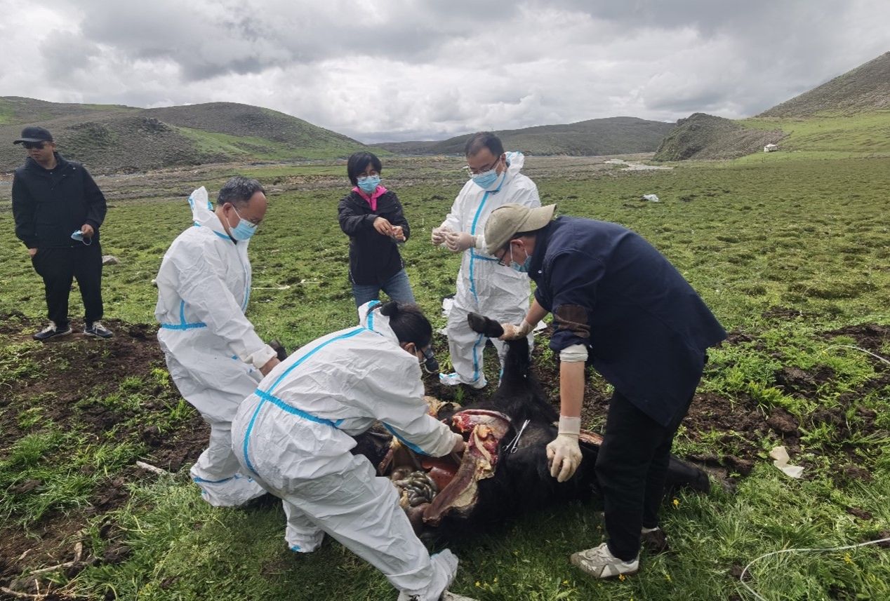 18日上午,在新龙县农牧农村科技局人员的陪同下,必赢中国官方网站四位专家又一次前往新龙县友谊乡,对牧户中的一头牦牛突然死亡进行现场病例解剖与疾病诊断。专家团队冒着高反的不适,在牧场下风口进行了为期一个半小时的病死牛只病例解剖。通过解剖发现,该牛只死于肺炎,气管中充满白色泡沫样痰,牛只运动导致急性呼吸衰竭而死亡,专家团队还对发病组织取样带回单位实验室进行病理学分析。随后,针对牧户反馈牦牛群中有部分牛只也出现相同病症,专家团队开具了处方单,并向牧户一一介绍了各药品的使用方法和剂量。