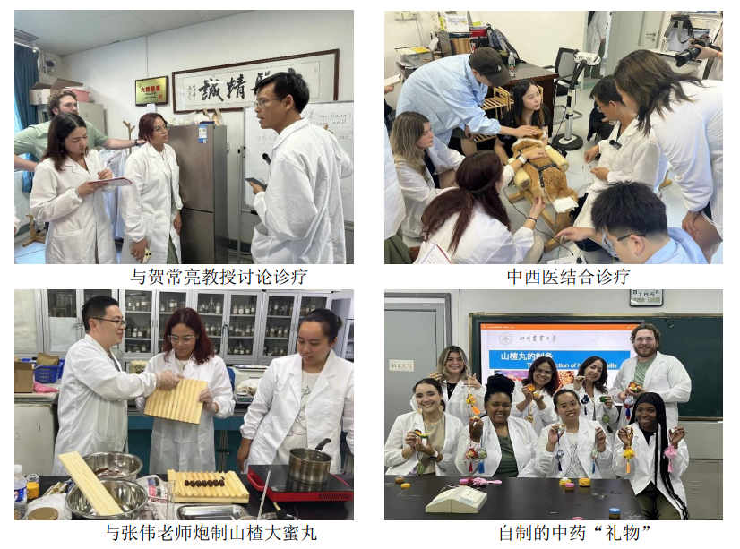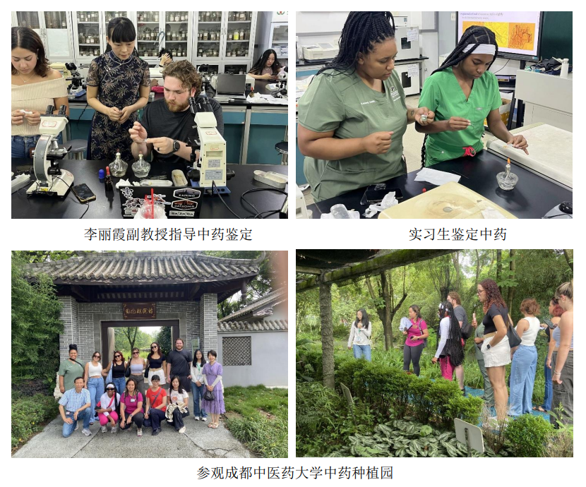 在中药材鉴赏环节,李丽霞和付羽萍两位老师分别针对中药基础理论和常见中药材(麦冬、黄连、红花、青蒿、僵蚕、石膏)性状与显微鉴别进行讲解,过程结合成都荷花池中药材专业市场实地考察、实践,以及成都中医药大学中医药传统文化博物馆及其中药种植园的参观学习,普及中药、中兽药的应用和推广前景。期间,药学系张伟老师更是现场教学,开启了中药传统炮制,一颗颗山楂大蜜丸、一盒盒消肿止痛膏,让8名普渡大学实习生乐于其中,而收获自制中药“礼物”。