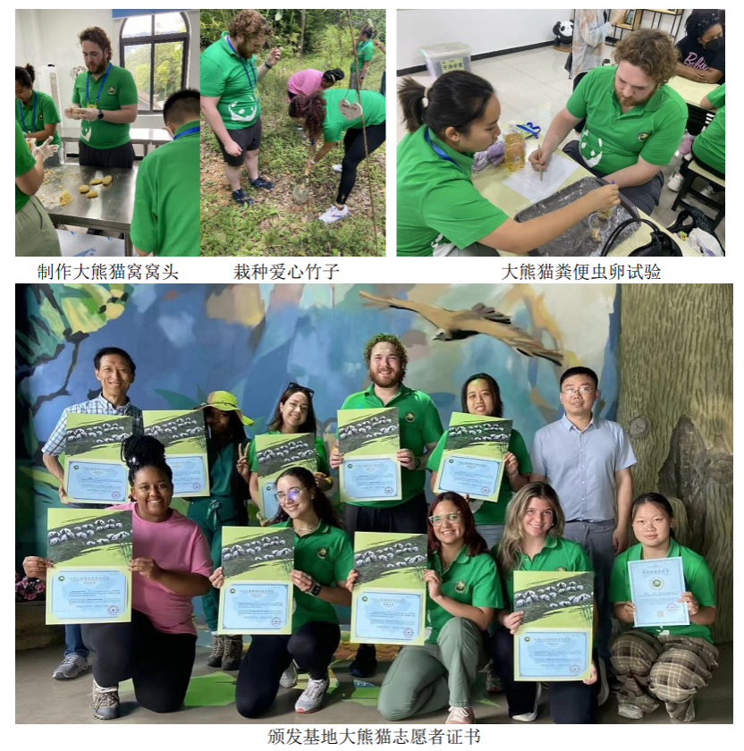 大熊猫作为野生动物旗舰物种,探秘“国宝”日常饲养管理与疫病防控也是本次普渡实习生之行的另一主题。在中国大熊猫保护研究中心雅安基地,8名实习生通过协助准备新鲜竹子、自制大熊猫窝窝头,了解大熊猫食性;通过不同大熊猫个体行为观察比较,了解大熊猫独特语言及行为习惯;通过与基地兽医院兽医师疫病防控交流,了解大熊猫常见疾病种类及防控措施;通过与大熊猫粪便虫卵试验,了解大熊猫常见寄生虫种类及药物驱虫选择原则;通过栽种爱心竹子,融入大熊猫保护事业,并写下大熊猫寄语。为期两天的大熊猫基地实习,实习生们不仅收获了基地导师颁发的熊猫志愿者证书,而且亲身感受了大熊猫文化以及兽医人在熊猫疾病防控中的当担。