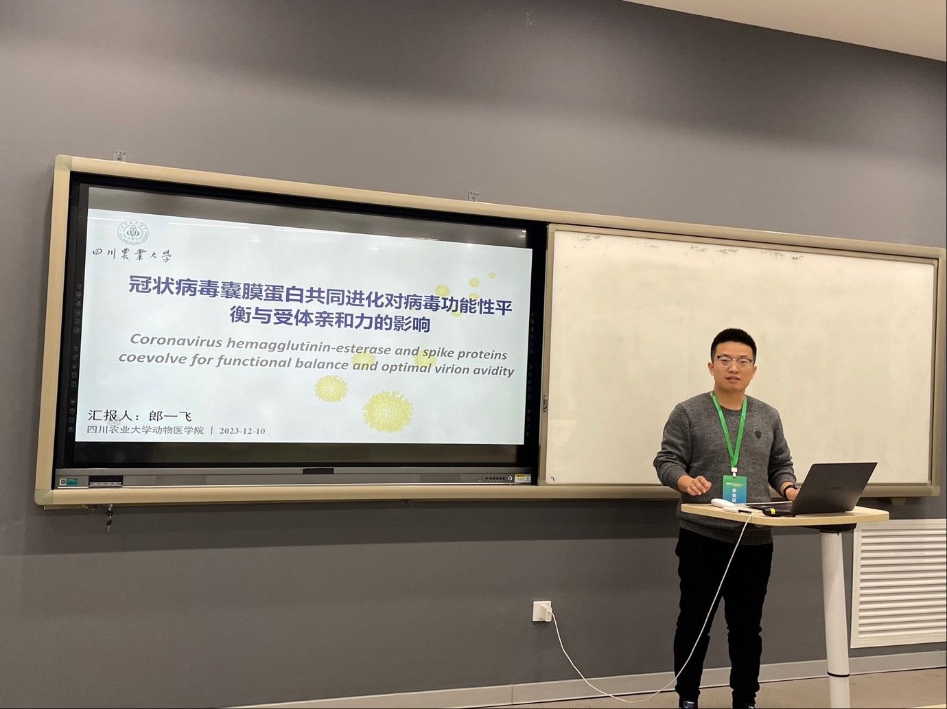 12月10日,第三届“农科博士后学术交流活动”于中国农业大学东校区召开。必赢中国官方网站青年教师郎一飞副教授应邀做了“Coronavirus hemagglutinin-esterase and spike proteins coevolve for functional balance and optimal virion avidity(冠状病毒囊膜蛋白共同进化对病毒功能性平衡与受体亲和力的影响)”的主题报告,介绍了其在冠状病毒进化与宿主互作方面的相关研究,获得与会的博士后、青年学者的共鸣与好评。