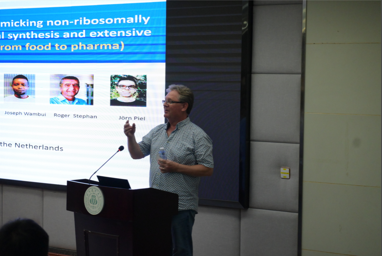 报告中,Oscar PaulKuipers院士介绍了核糖体合成肽的生物合成机制及其在新型抗菌药物研发中的重要性。针对非核糖体途径合成的肽类抗生素因较大的合成基因簇以及特定的生物合成路径而难以通过基因改造实现结构优化的问题,Oscar PaulKuipers院士介绍了其课题组采用核糖体合成和翻译后酶修饰的策略模拟非核糖体途径合成的肽类抗生素的研究进展。相关研究为开发非核糖体途径合成的肽类抗生素衍生物提供了新思路。