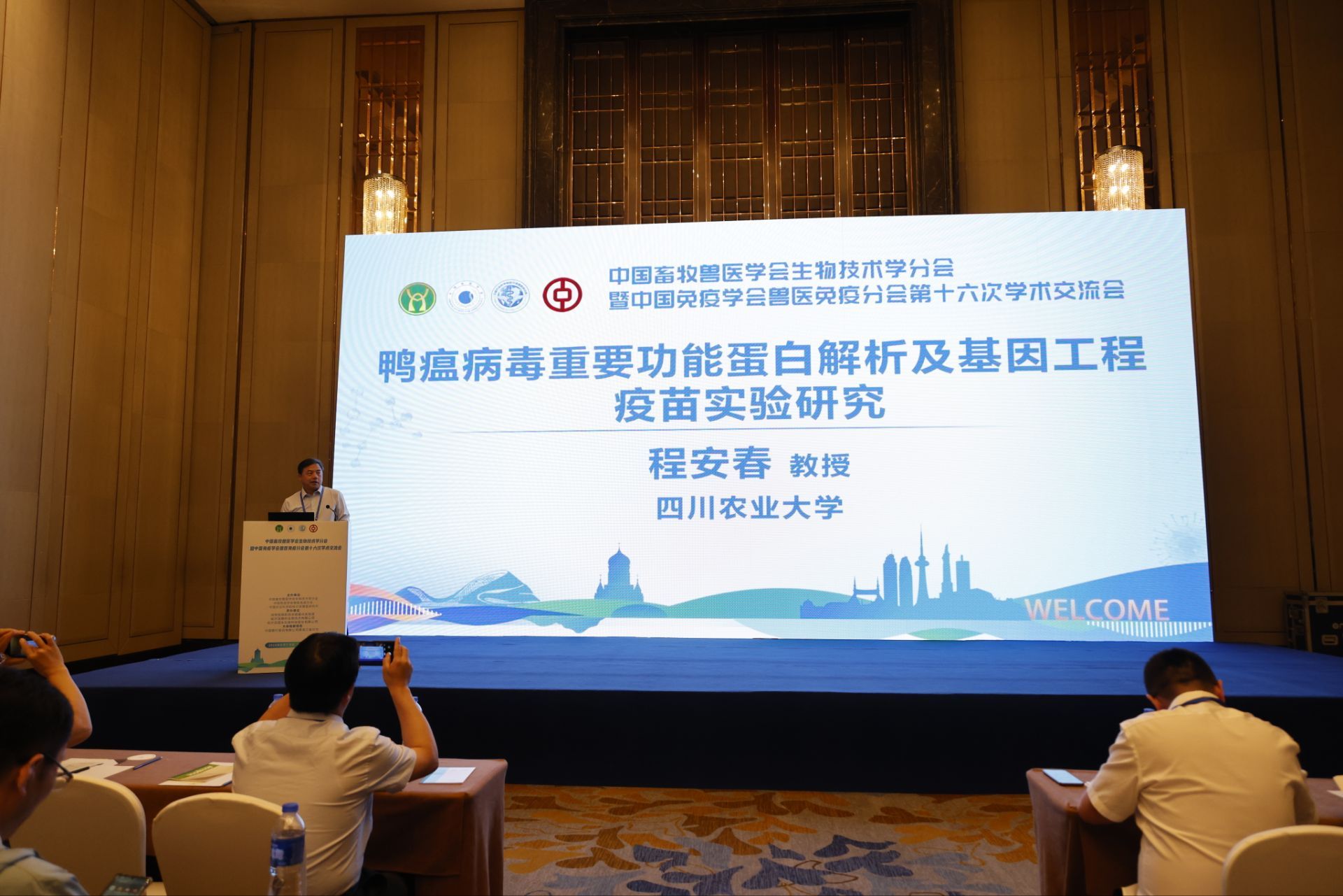 程安春教授以《鸭瘟病毒重要功能蛋白解析及基因工程疫苗实验研究》为题,作了兽医免疫分会主题报告。他向与会专家们分享了其研究团队在解析鸭瘟病毒US3等重要病毒编码蛋白方面取得的最新研究成果以及在研发鸭瘟病毒gE-/gI-双基因缺失疫苗株等重要基因工程疫苗过程中取得的突出科研成果,并介绍了鸭瘟病毒作为疫苗活载体的构建方法、优势及未来的研究方向。程安春教授团队近年在鸭瘟病毒研究中取得了突出的科研成果,获得多项国家级奖励,得到了与会专家们的高度评价。