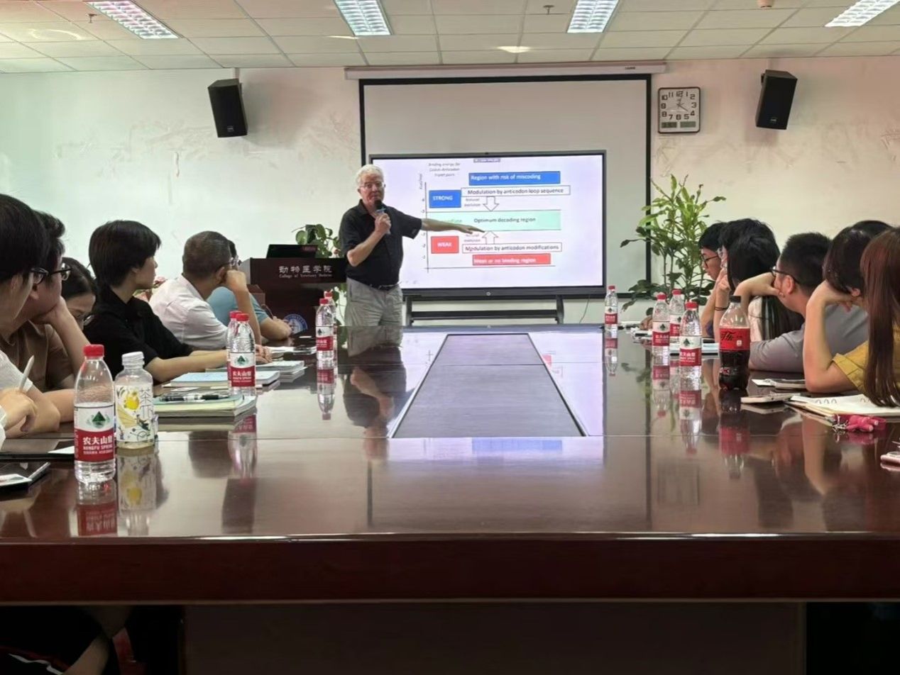 报告会上,Eric Westhof院士详细讲解了tRNA解码修饰的基本原理。他从遗传密码解码能量视角、碱基配对、碱基移动等多个方面进行了深入阐述,特别强调了tRNA修饰对翻译解码的效率、保真度以及核糖体tRNA与mRNA立体化学结构适应的重要影响。学院师生们听得津津有味,纷纷表示受益匪浅。